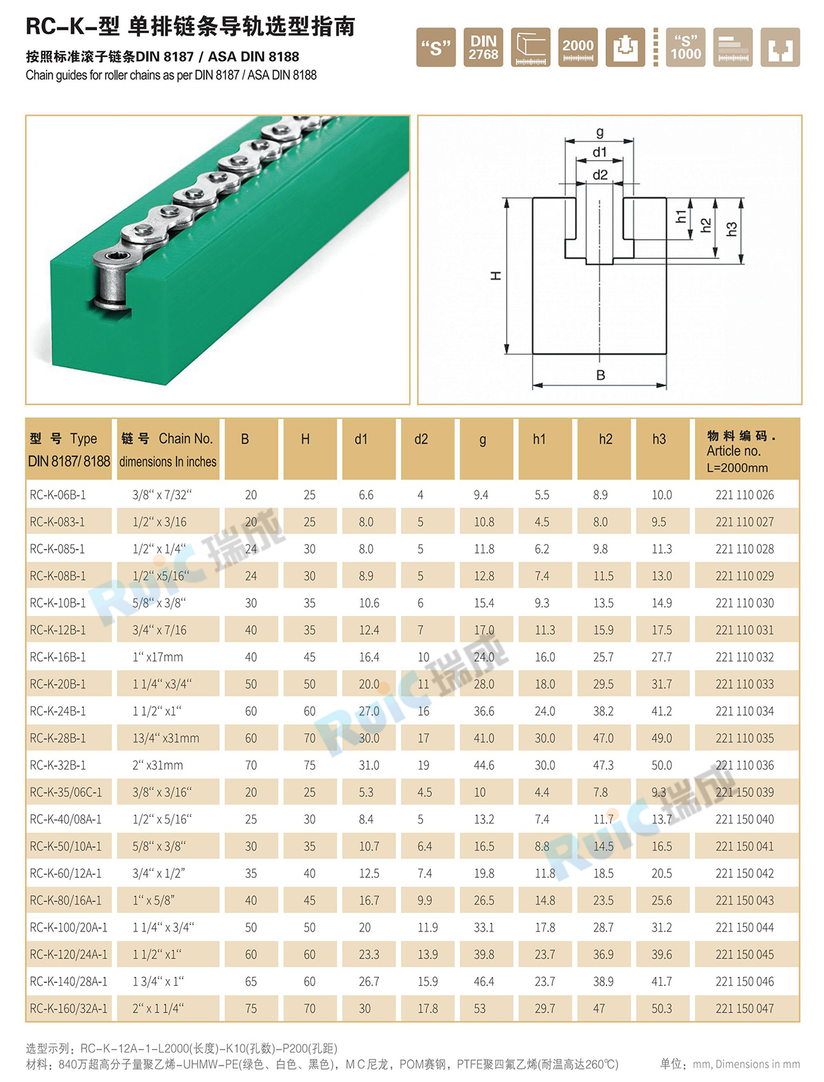 鏈條導(dǎo)軌-鏈條導(dǎo)向件,是一種靜壓導(dǎo)軌,用于支撐和導(dǎo)向鏈條,減少鏈條磨擦,降低噪音,增強(qiáng)鏈條使用壽命。采用840萬超高分子量聚乙烯(UHMW-PE)生產(chǎn),鏈條導(dǎo)軌具有高耐磨耐溫,抗腐蝕,穩(wěn)固,降噪音等高精度的支撐與導(dǎo)向。