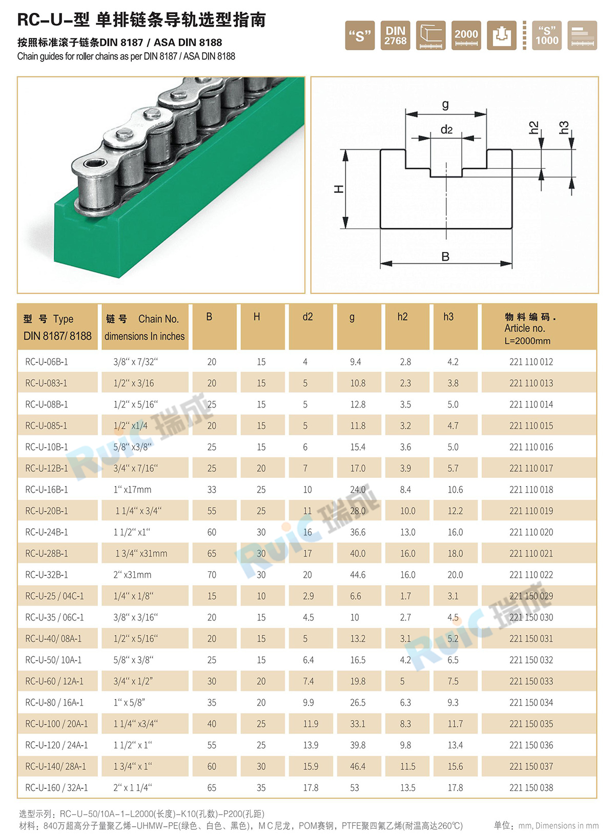 鏈條導(dǎo)軌-鏈條導(dǎo)向件,是一種靜壓導(dǎo)軌,用于支撐和導(dǎo)向鏈條,減少鏈條磨擦,降低噪音,增強(qiáng)鏈條使用壽命。采用840萬(wàn)超高分子量聚乙烯(UHMW-PE)生產(chǎn),鏈條導(dǎo)軌具有高耐磨耐溫,抗腐蝕,穩(wěn)固,降噪音等高精度的支撐與導(dǎo)向。