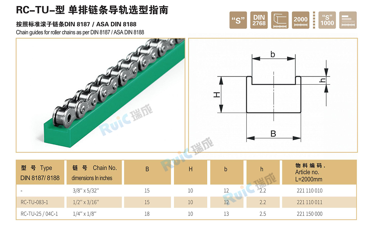 鏈條導軌-鏈條導向件,是一種靜壓導軌,用于支撐和導向鏈條,減少鏈條磨擦,降低噪音,增強鏈條使用壽命。采用840萬超高分子量聚乙烯(UHMW-PE)生產,鏈條導軌具有高耐磨耐溫,抗腐蝕,穩固,降噪音等高精度的支撐與導向。