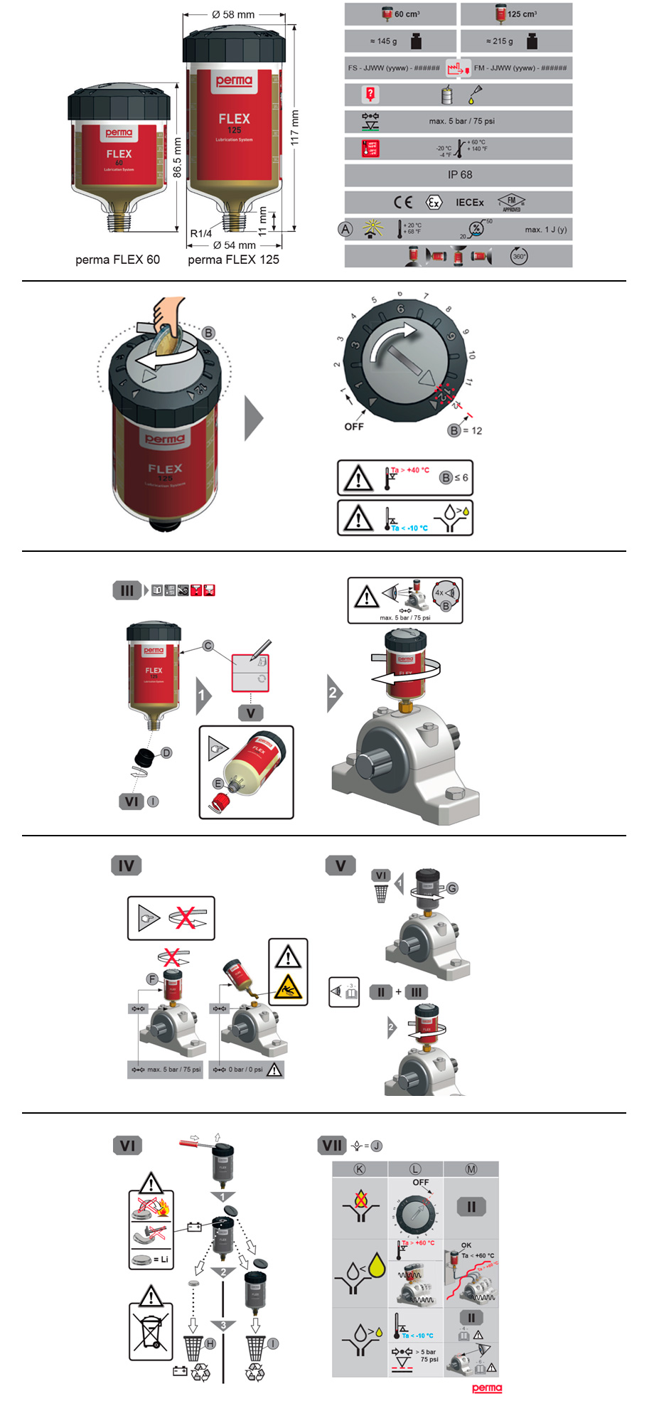 perma FLEX 作為全套裝置的一部分,是緊湊、隨時(shí)可用的潤(rùn)滑系統(tǒng)。它可用于溫度范圍 從 -20 °C 至 +60 °C 的各類(lèi)應(yīng)用。排油周期設(shè)置可從 1 到 12 個(gè)月隨意調(diào)整。通過(guò)電子控制 的化學(xué)反應(yīng)產(chǎn)生所需的壓力。在整個(gè)選定的排油周期,不斷向潤(rùn)滑點(diǎn)提供清潔干凈的潤(rùn)滑 油。perma FLEX 有 60 立方厘米和 125 立方厘米的尺寸可供使用。