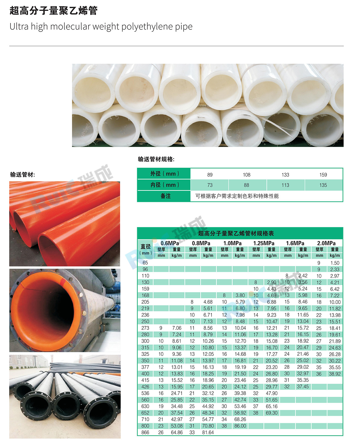 8、糧食輸送;衛(wèi)生無(wú)毒、高速輸送、不堵料、耐磨損、性價(jià)比高。超高分子量聚乙烯(UHMW-PE)管材規(guī)格及使用工作壓力可根據(jù)用戶要求制作。